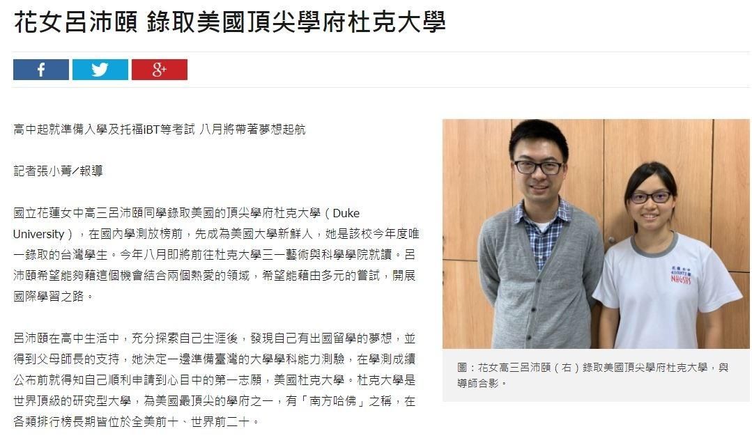 新聞報導:花女呂沛頤 錄取美國頂尖學府杜克大學